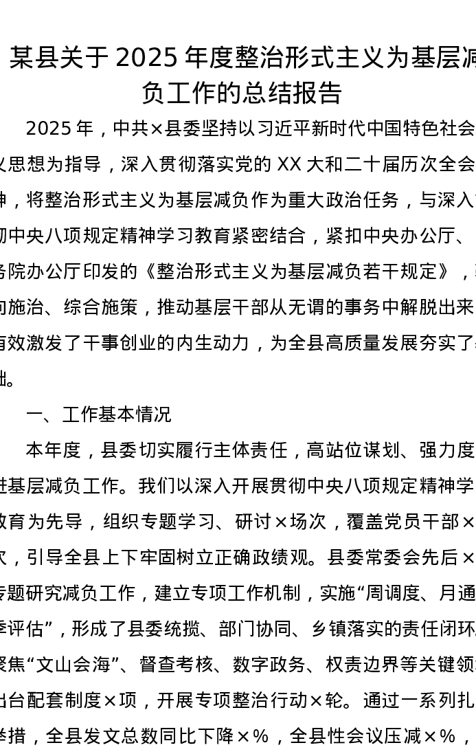 某县关于2025年度整治形式主义为基层减负工作的总结报告
