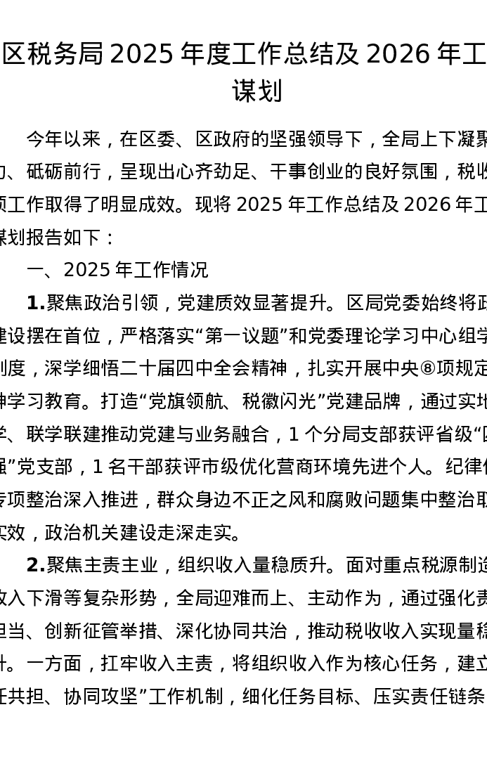 区税务局2025年度工作总结及2026年工作谋划