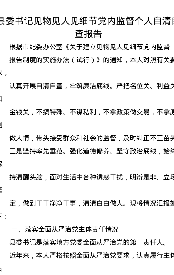 县委书记见物见人见细节党内监督个人自清自查报告