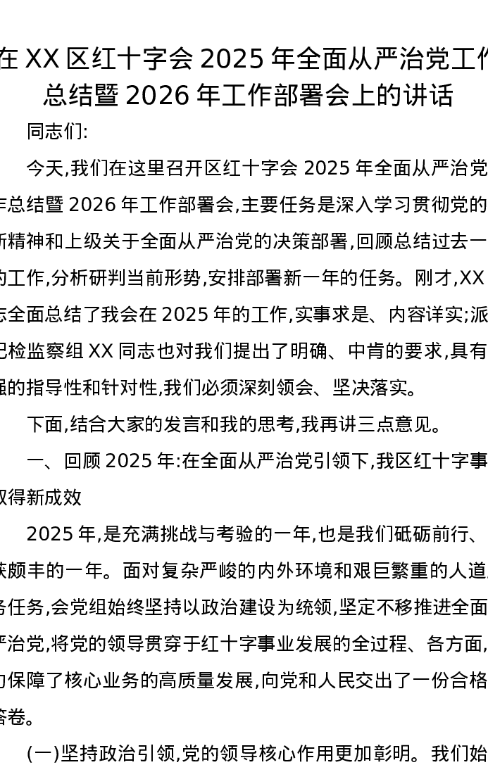 在XX区红十字会2025年全面从严治党工作总结暨2026年工作部署会上的讲话