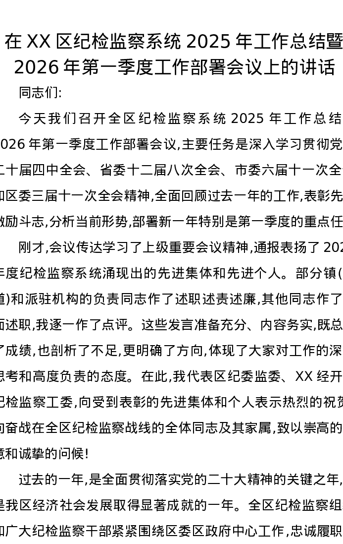在XX区纪检监察系统2025年工作总结暨2026年第一季度工作部署会议上的讲话