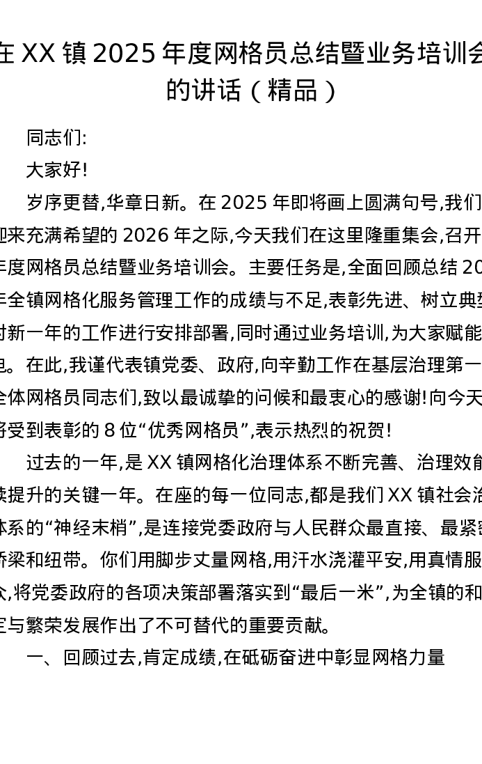 在XX镇2025年度网格员总结暨业务培训会上的讲话