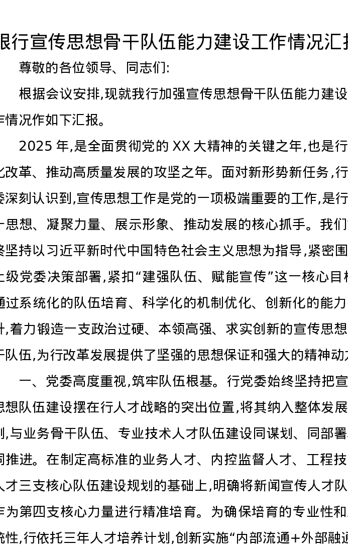 银行宣传思想骨干队伍能力建设工作情况汇报