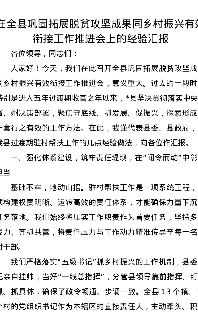在全县巩固拓展脱贫攻坚成果同乡村振兴有效衔接工作推进会上的经验汇报