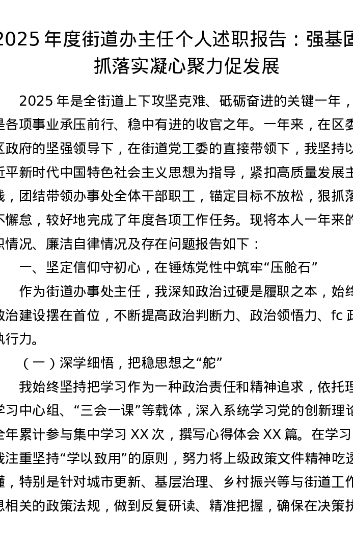 2025年度街道办主任个人述职报告:强基固本抓落实 凝心聚力促发展