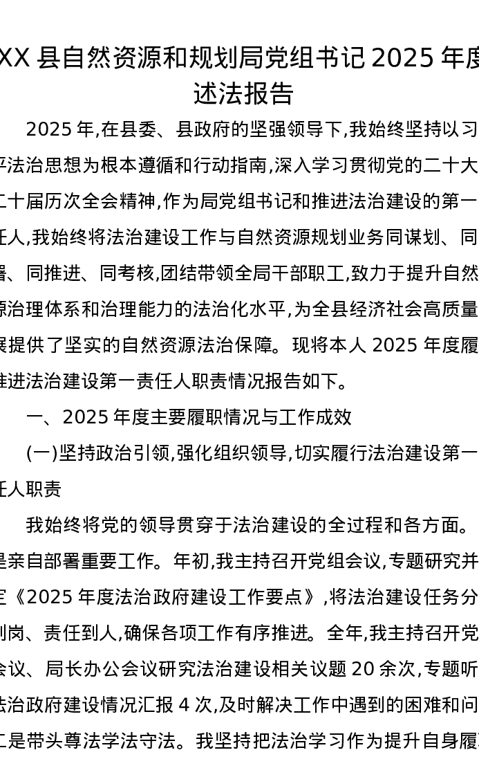 XX县自然资源和规划局党组书记2025年度述法报告