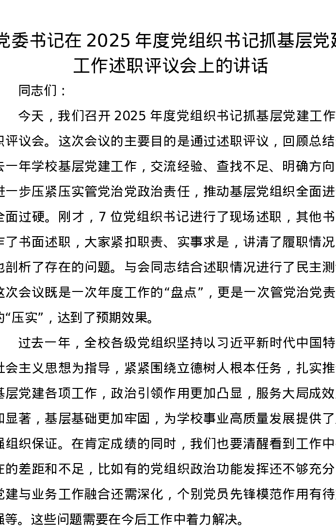 党委书记在2025年度党组织书记抓基层党建工作述职评议会上的讲话