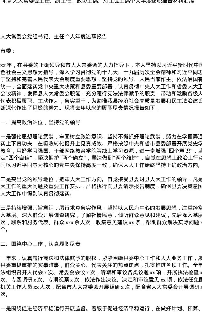 汇编:人大常委会主任、副主任、政协主席、总工会主席个人年度述职报告4篇