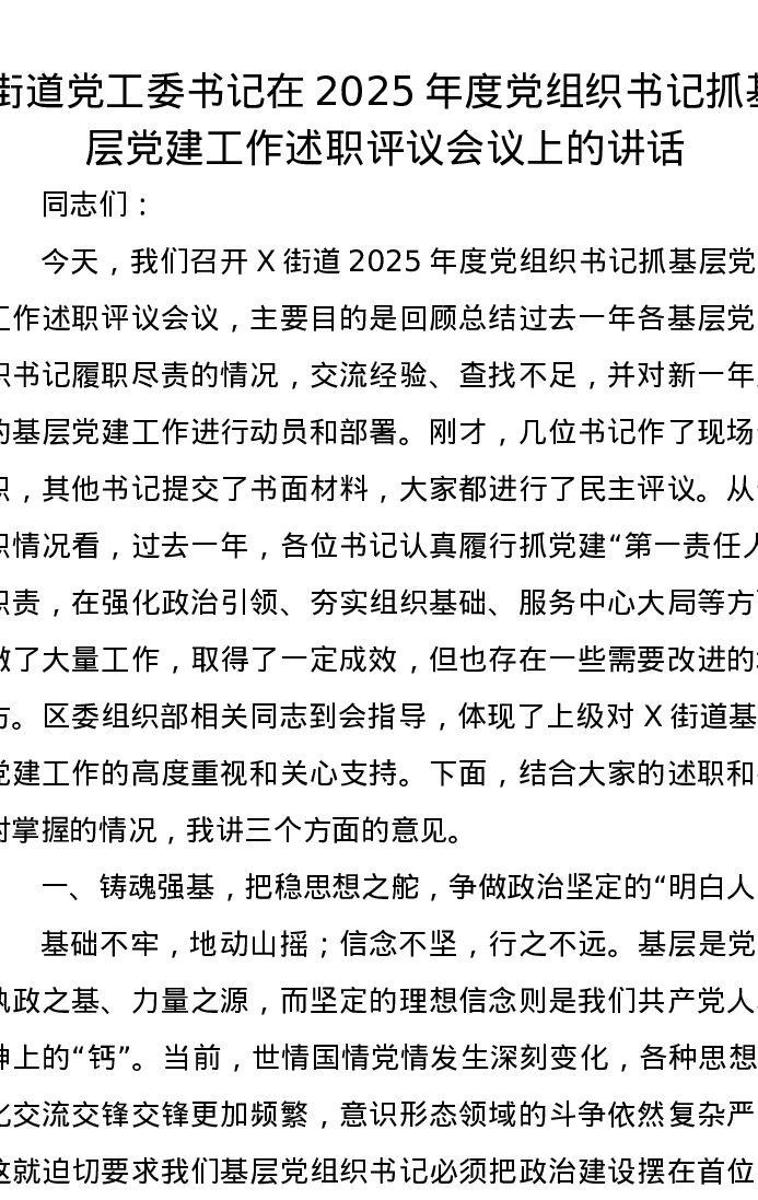 街道党工委书记在2025年度党组织书记抓基层党建工作述职评议会议上的讲话