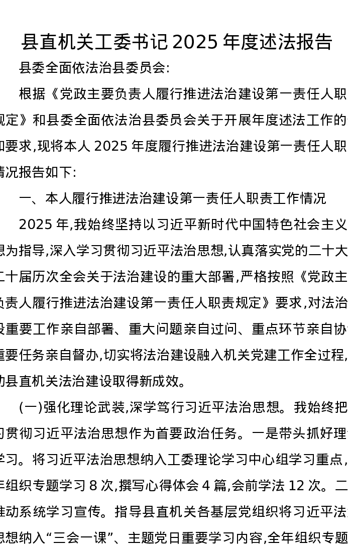 县直机关工委书记2025年度述法报告