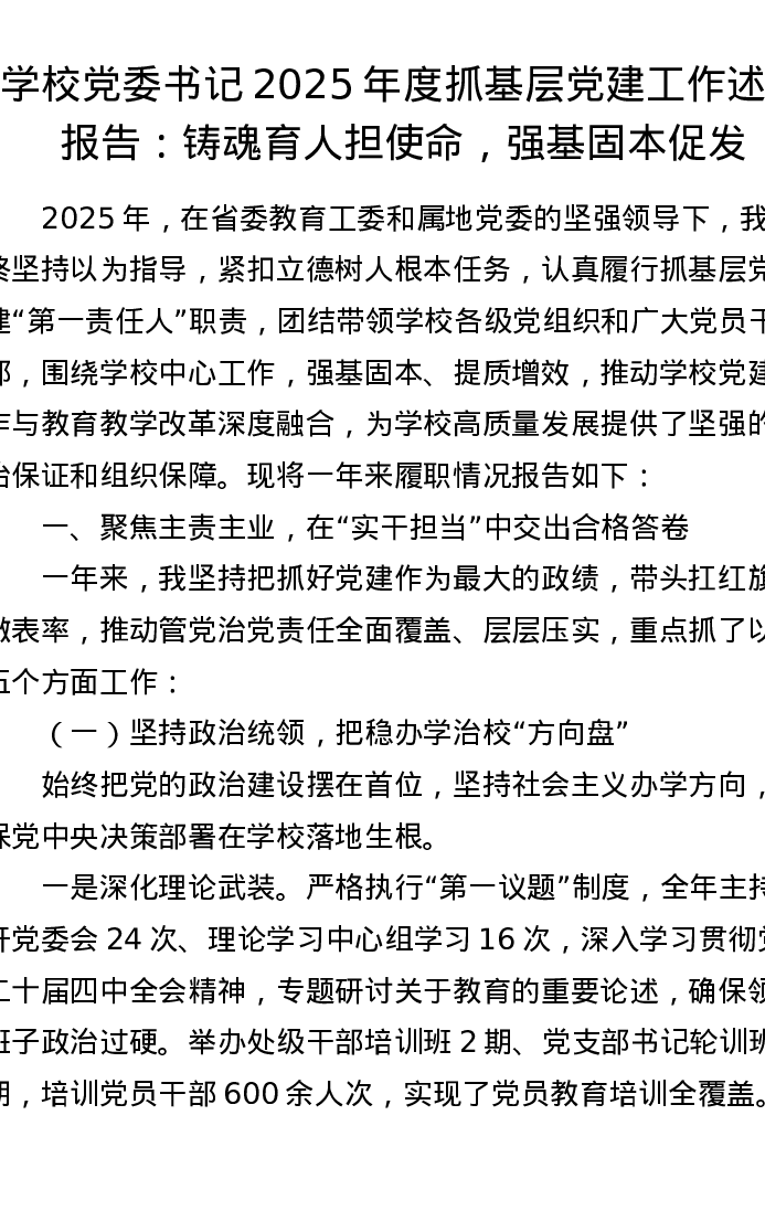 学校党委书记2025年度抓基层党建工作述职报告:铸魂育人担使命,强基固本促发展