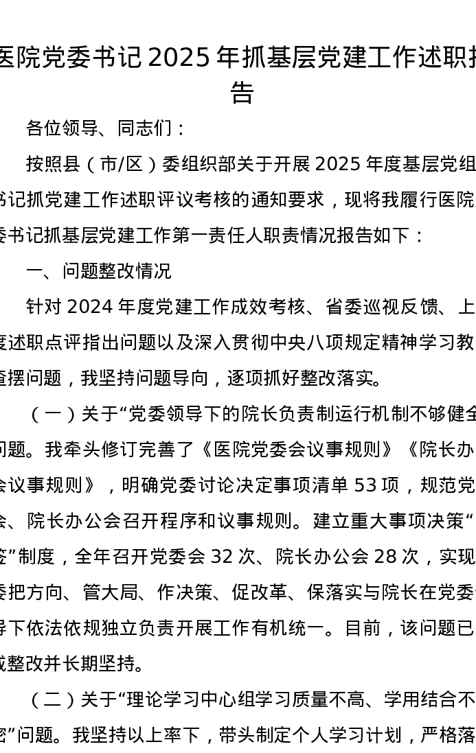 医院党委书记2025年抓基层党建工作述职报告