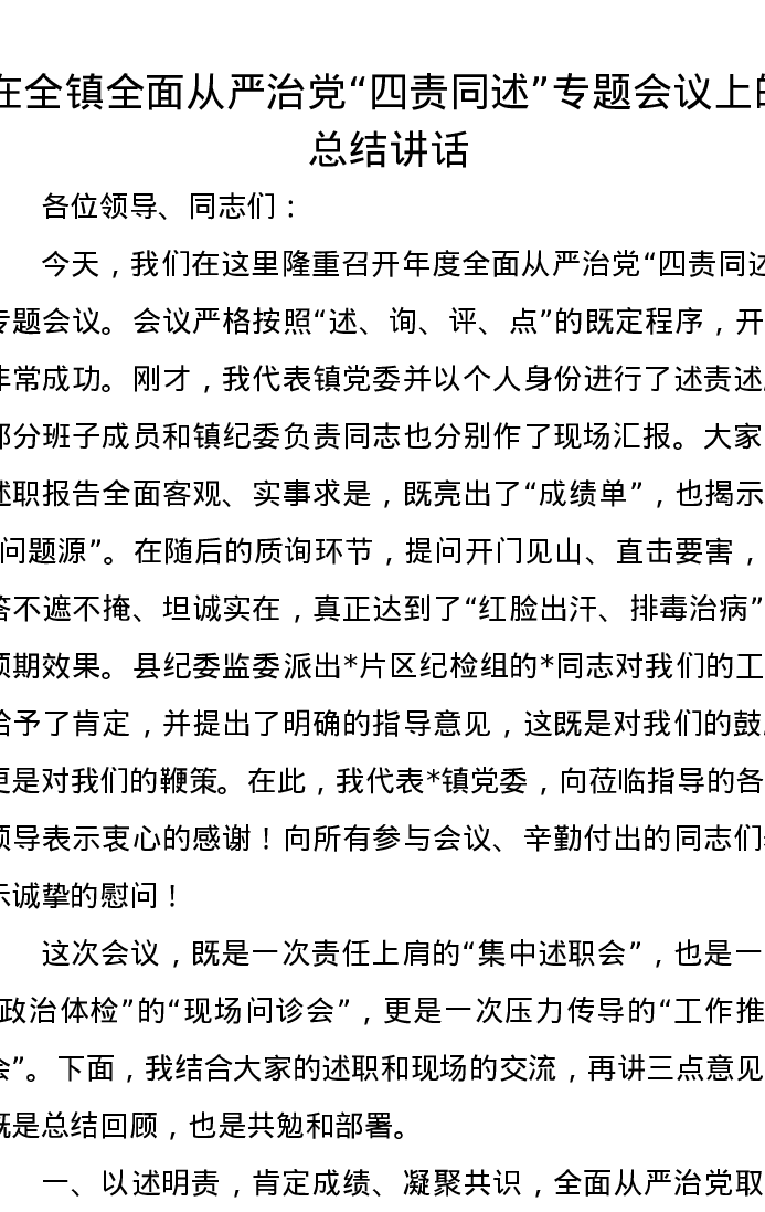 在全镇全面从严治党四责同述专题会议上的总结讲话