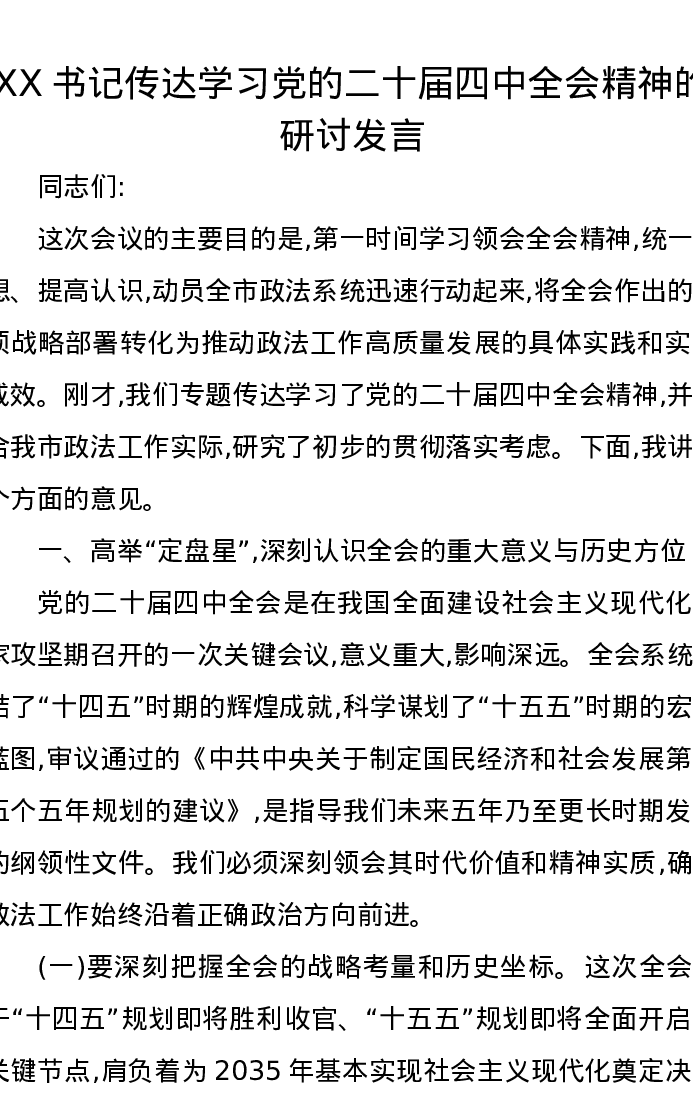 XX书记传达学习党的二十届四中全会精神的研讨发言