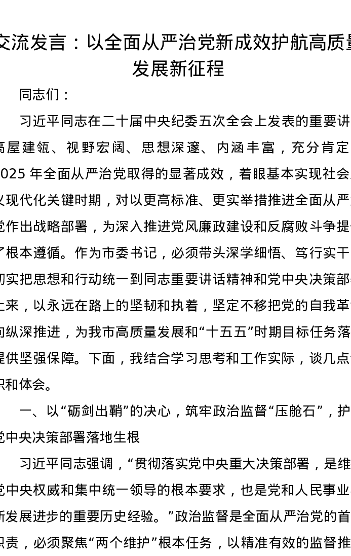 交流发言:以全面从严治党新成效护航高质量发展新征程