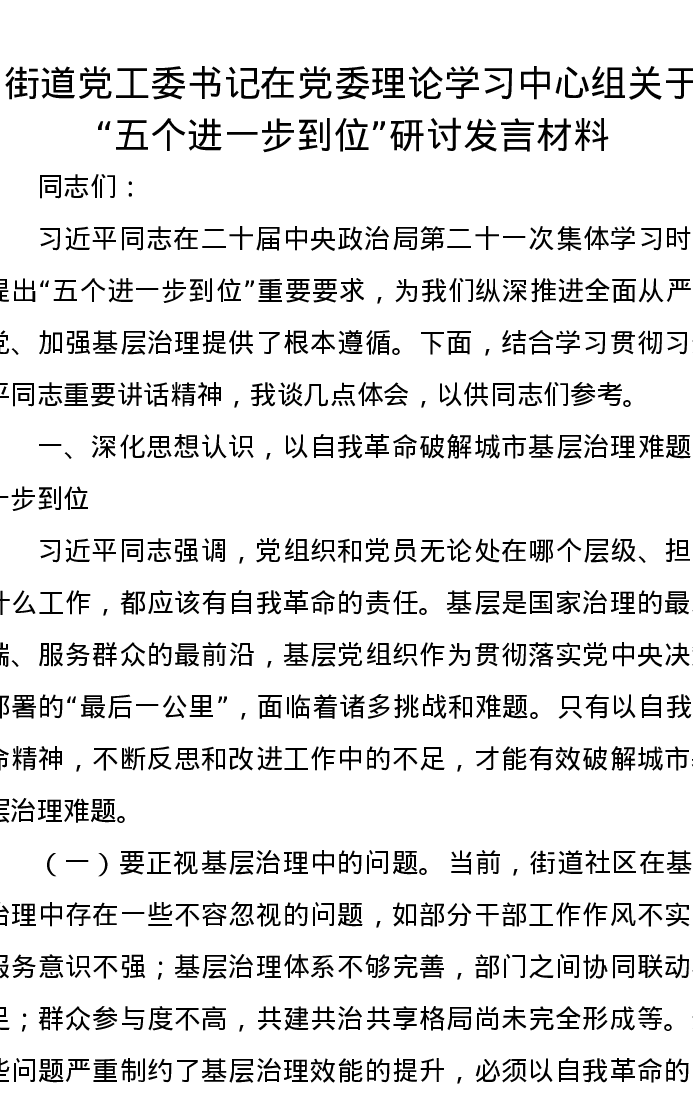 街道党工委书记在党委理论学习中心组关于五个进一步到位研讨发言材料