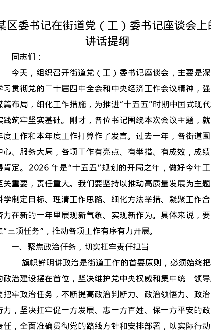 某区委书记在街道党(工)委书记座谈会上的讲话提纲
