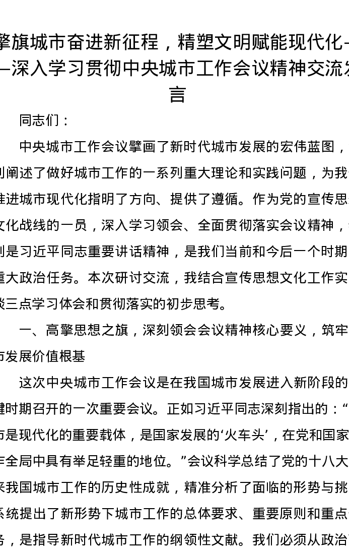擎旗城市奋进新征程,精塑文明赋能现代化——深入学习贯彻中央城市工作会议精神交流发言