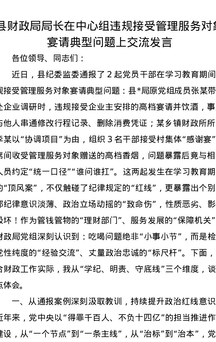 县财政局局长在中心组违规接受管理服务对象宴请典型问题上交流发言