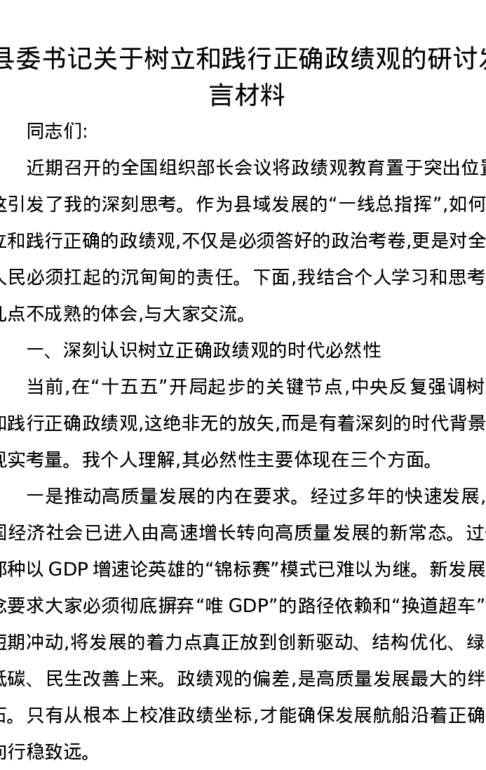 县委书记关于树立和践行正确政绩观的研讨发言材料