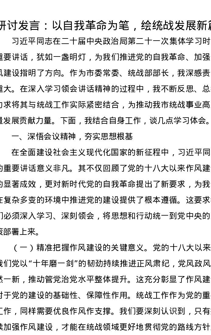 研讨发言:以自我革命为笔,绘统战发展新篇