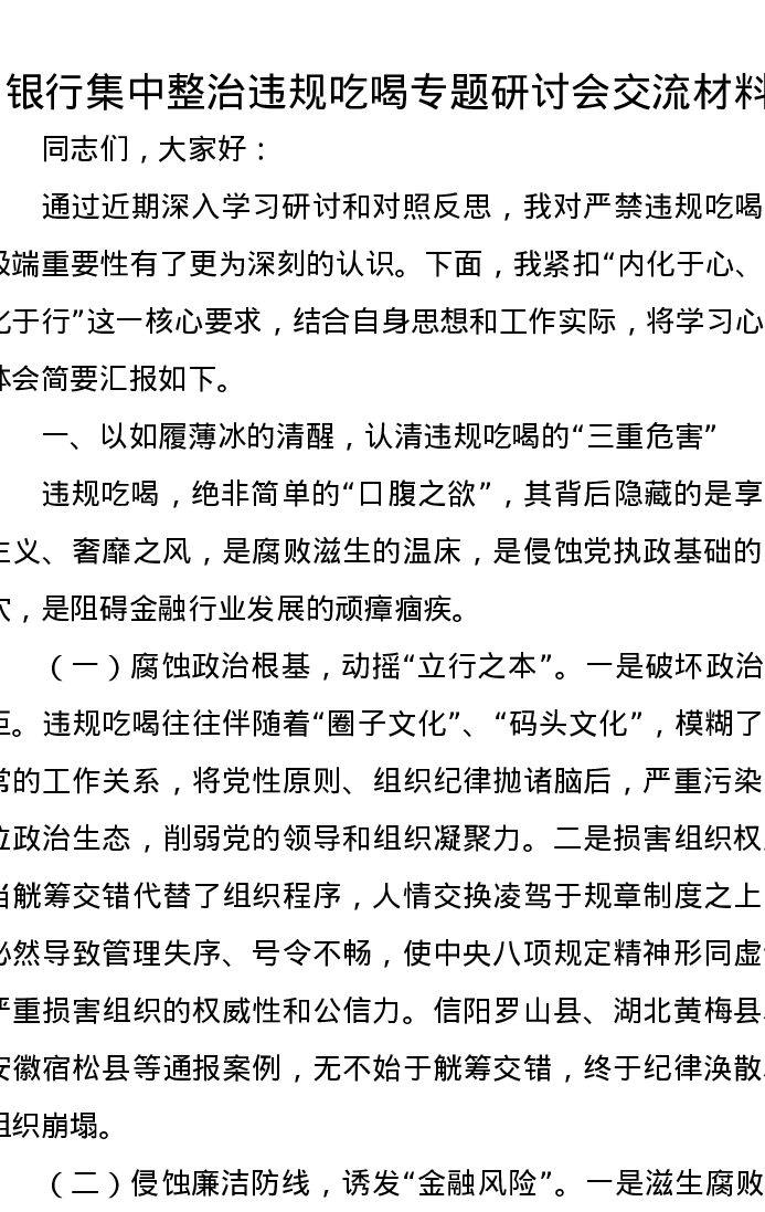 银行集中整治违规吃喝专题研讨会交流发言材料