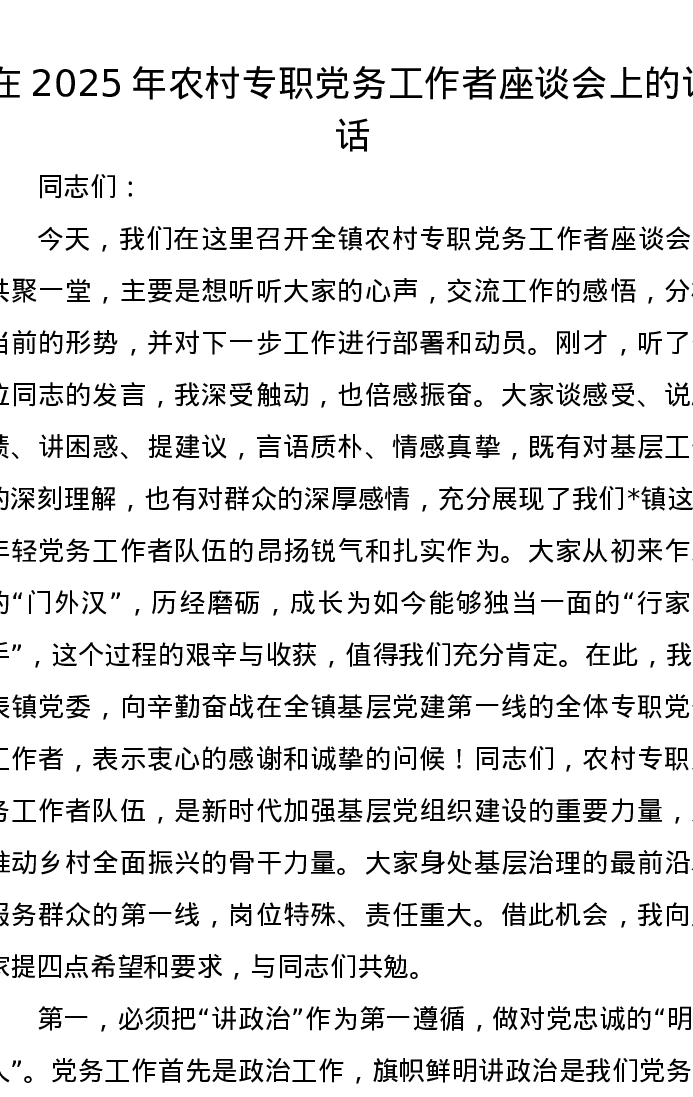 在2025年农村专职党务工作者座谈会上的讲话