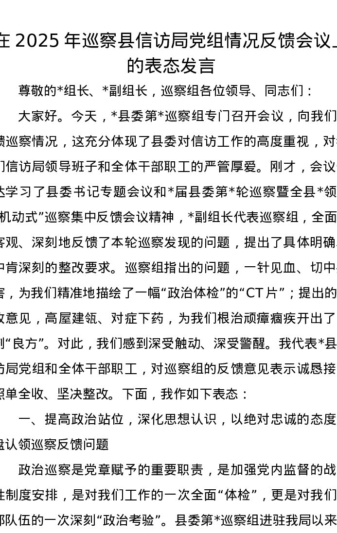 在2025年巡察县信访局党组情况反馈会议上的表态发言