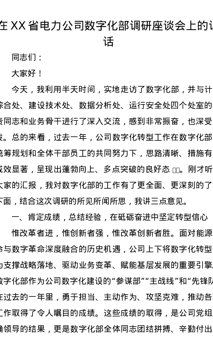 在XX省电力公司数字化部调研座谈会上的讲话