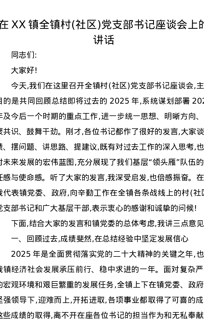 在XX镇全镇村(社区)党支部书记座谈会上的讲话