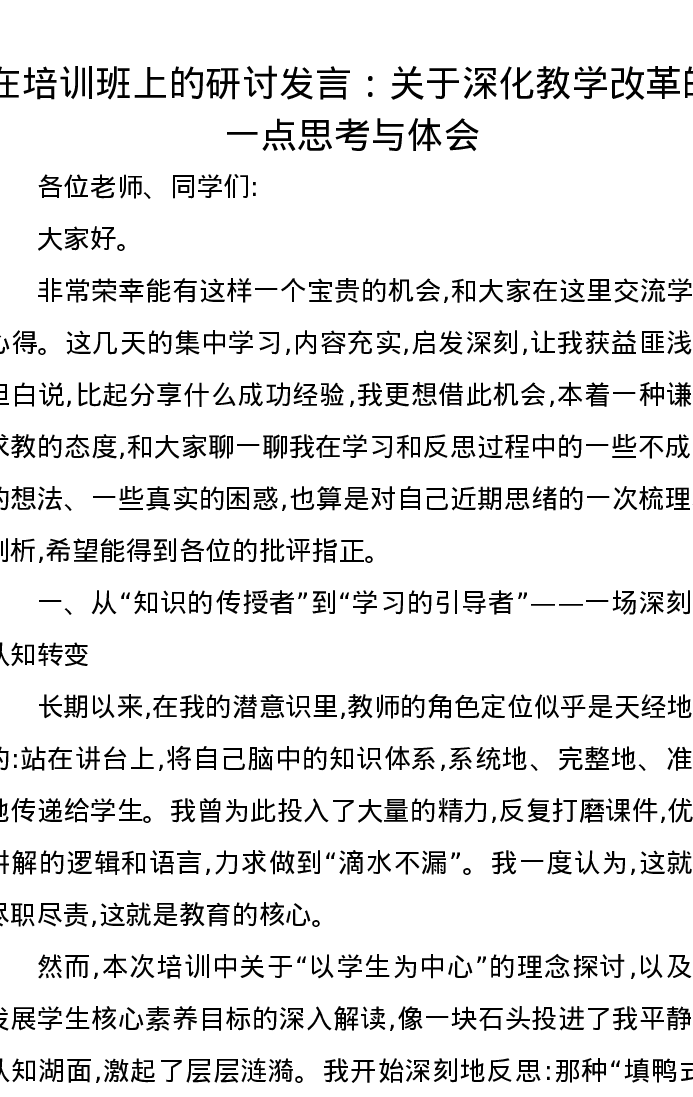 在培训班上的研讨发言:关于深化教学改革的一点思考与体会