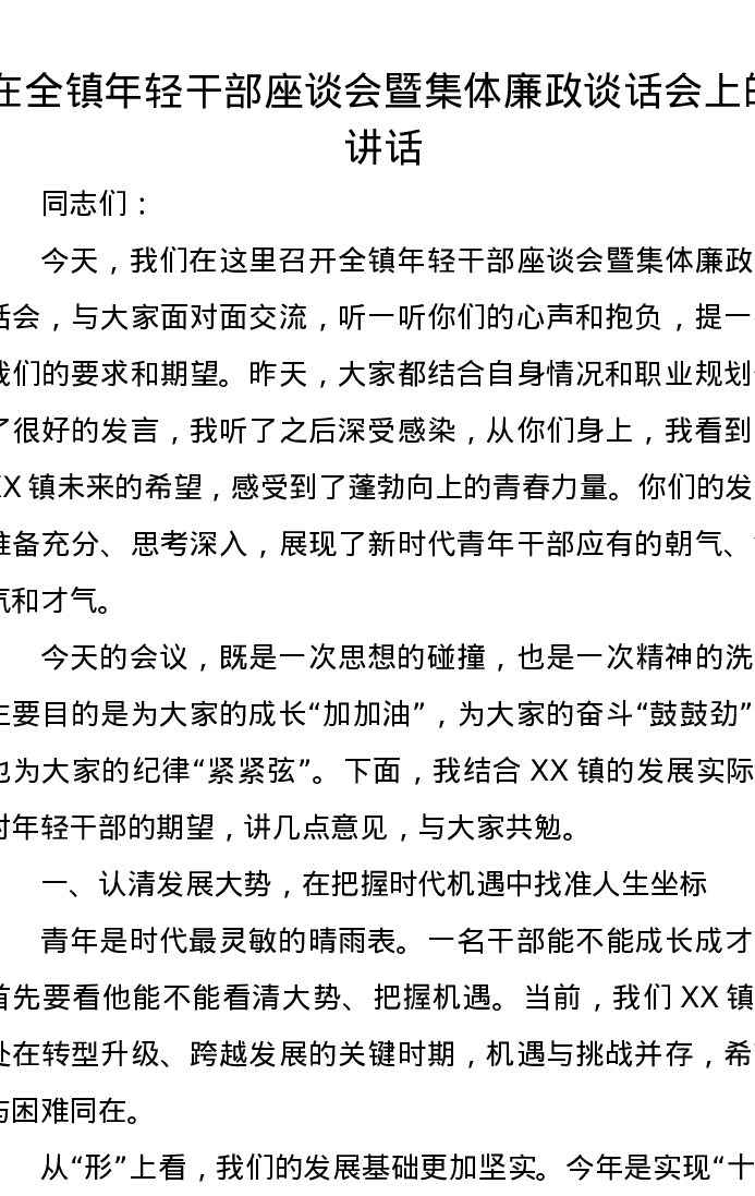 在全镇年轻干部座谈会暨集体廉政谈话会上的讲话