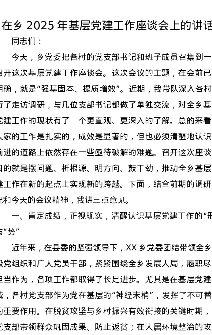在乡2025年基层党建工作座谈会上的讲话