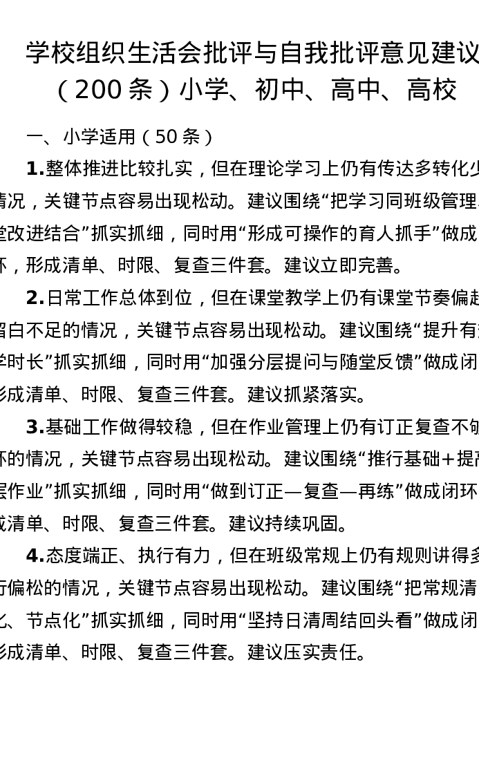 (小学、初中、高中、高校)组织xxx批评与自我批评意见建议200条