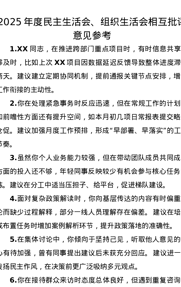 2025年度xxxxx、组织xxx相互批评意见参考