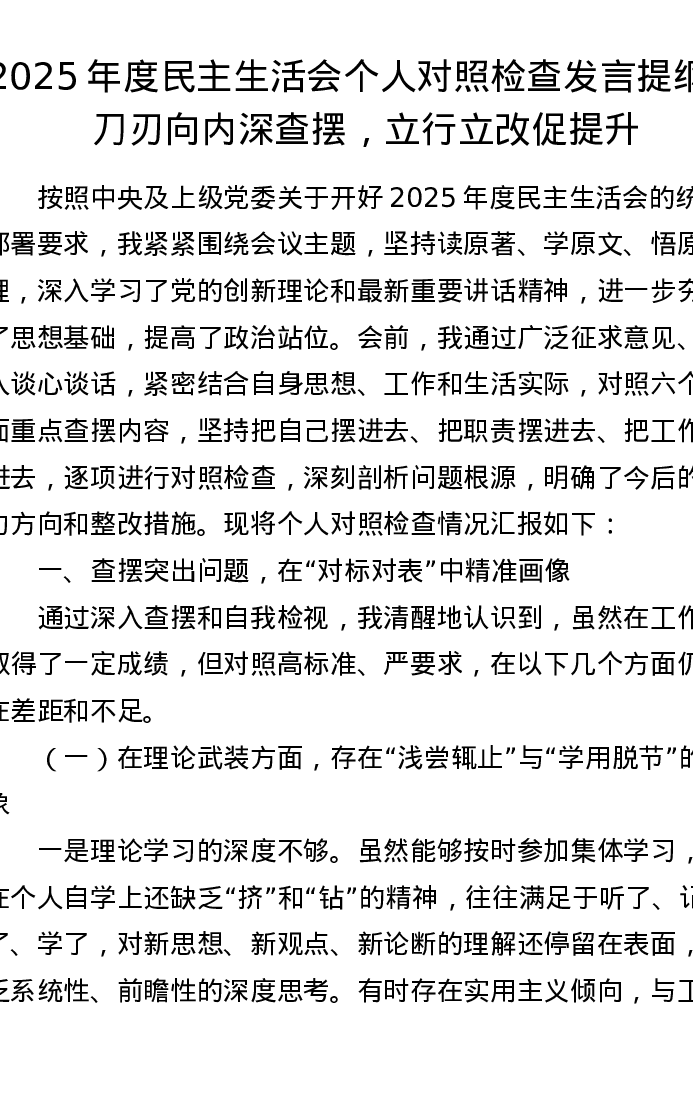 2025年度xxxxx个人对照检查发言提纲:刀刃向内深查摆,立行立改促提升
