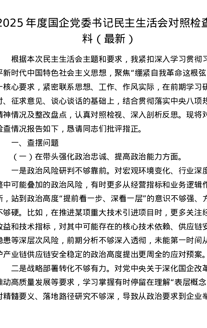 2025年度国企党委书记xxxxx对照检查材料(最新)