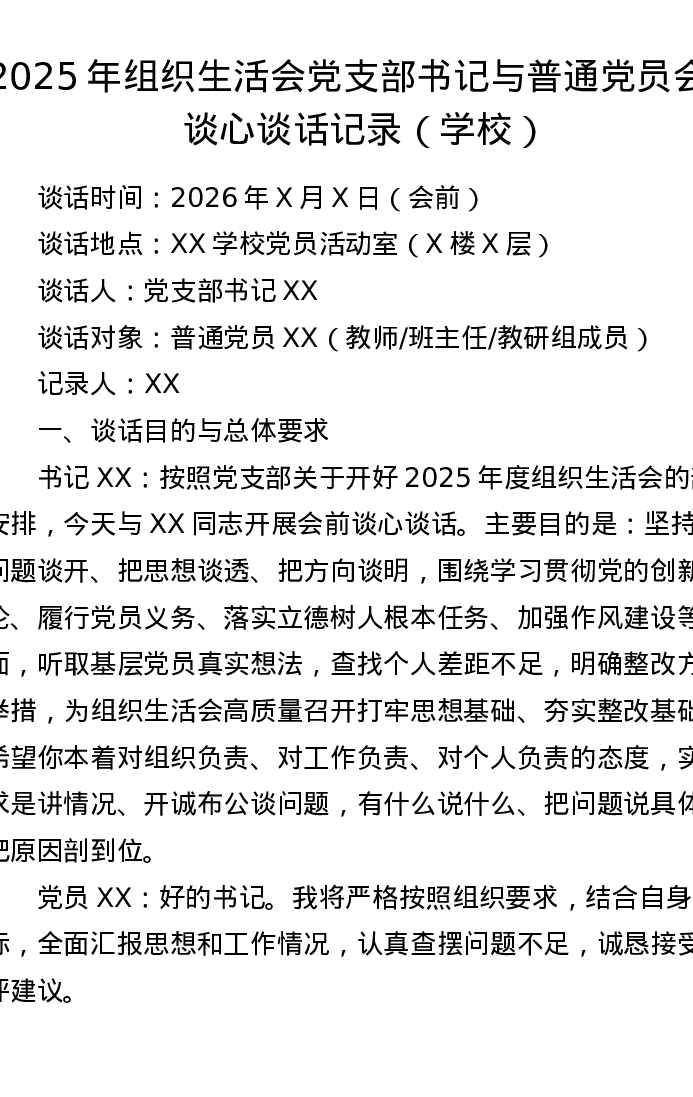 2025年组织xxx党支部书记与普通党员会前谈心谈话记录(学校)