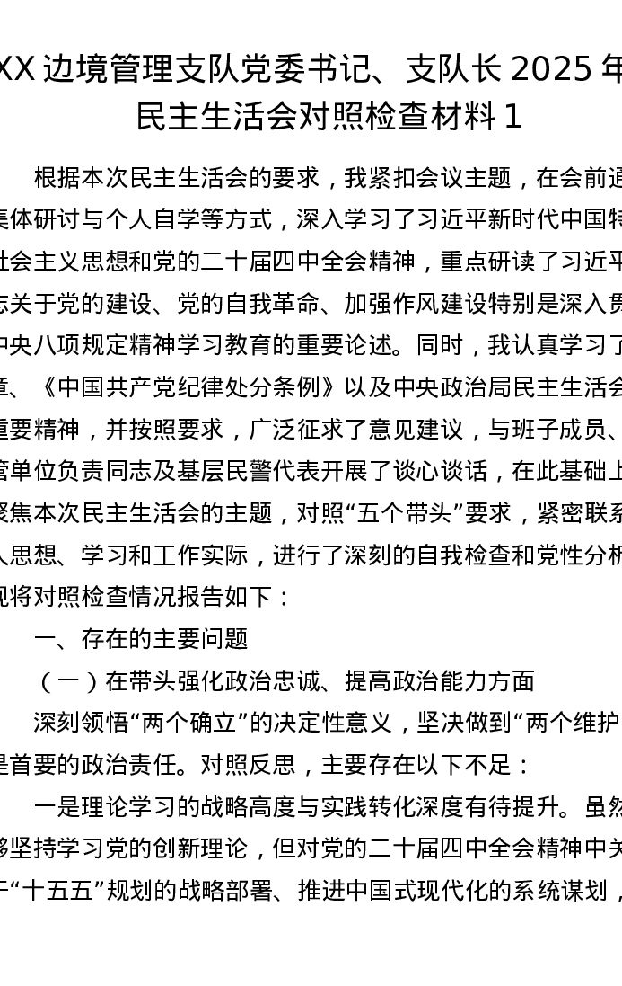 XX边境管理支队党委书记、支队长2025年度xxxxx对照检查材料1