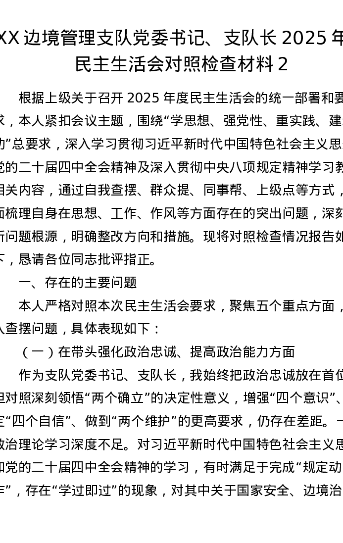 XX边境管理支队党委书记、支队长2025年度xxxxx对照检查材料2