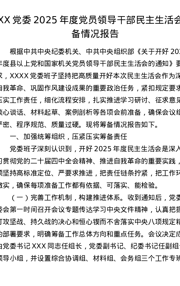 XX党委2025年度党员领导干部xxxxx筹备情况报告