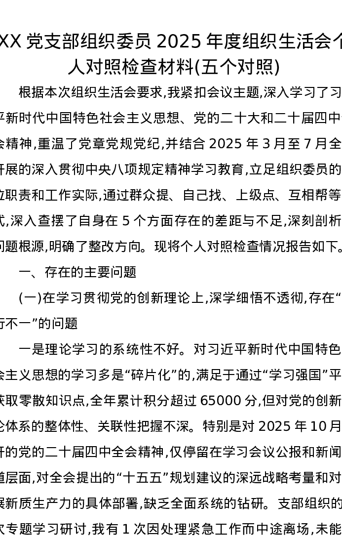 XX党支部组织委员2025年度组织xxx个人对照检查材料(五个对照)