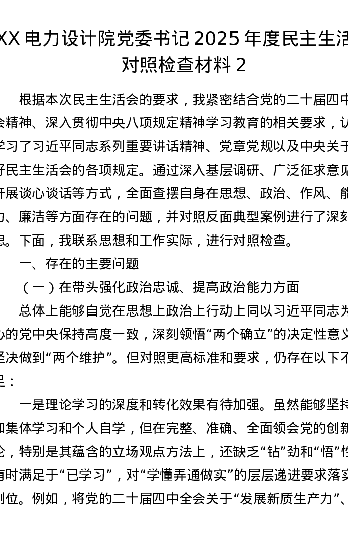 XX电力设计院党委书记2025年度xxxxx对照检查材料2