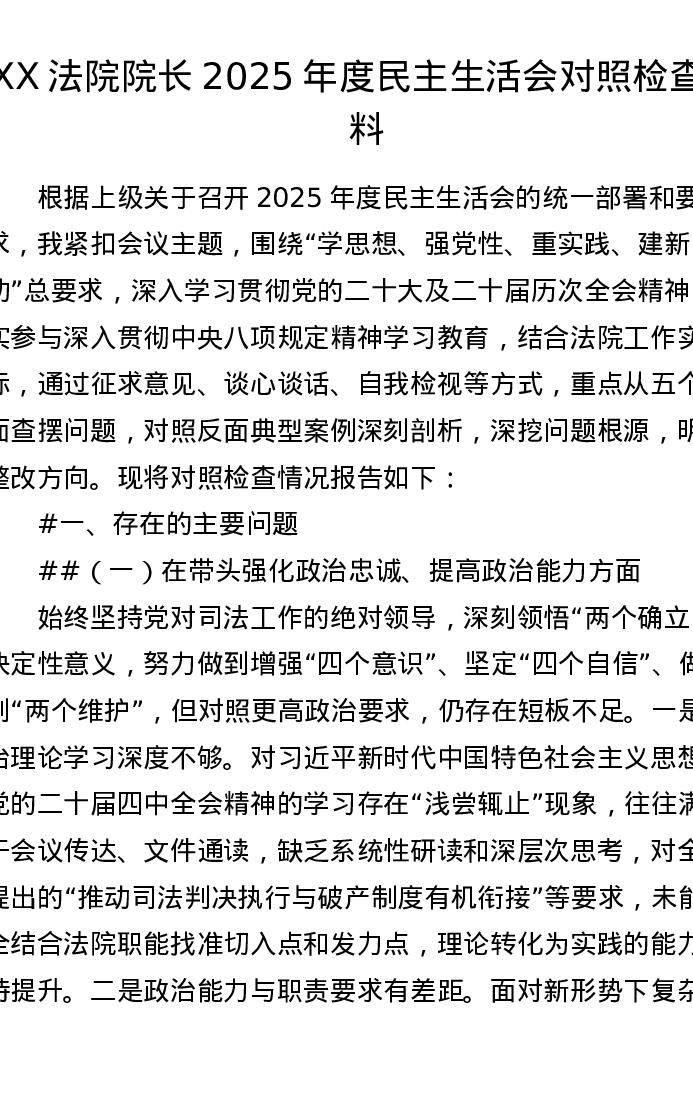 XX法院院长2025年度xxxxx对照检查材料(6170字)