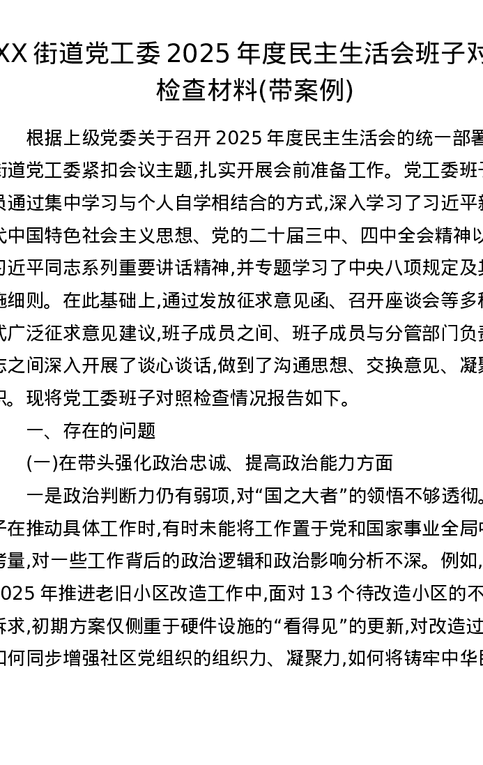 XX街道党工委2025年度xxxxx班子对照检查材料(带案例)