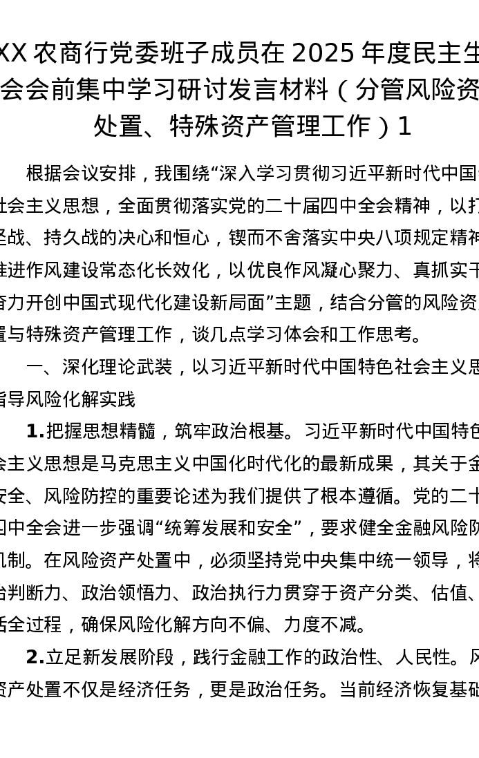 XX农商行党委班子成员在2025年度xxxxx会前集中学习研讨发言材料(分管风险资产处置、特殊资产管理工作)1