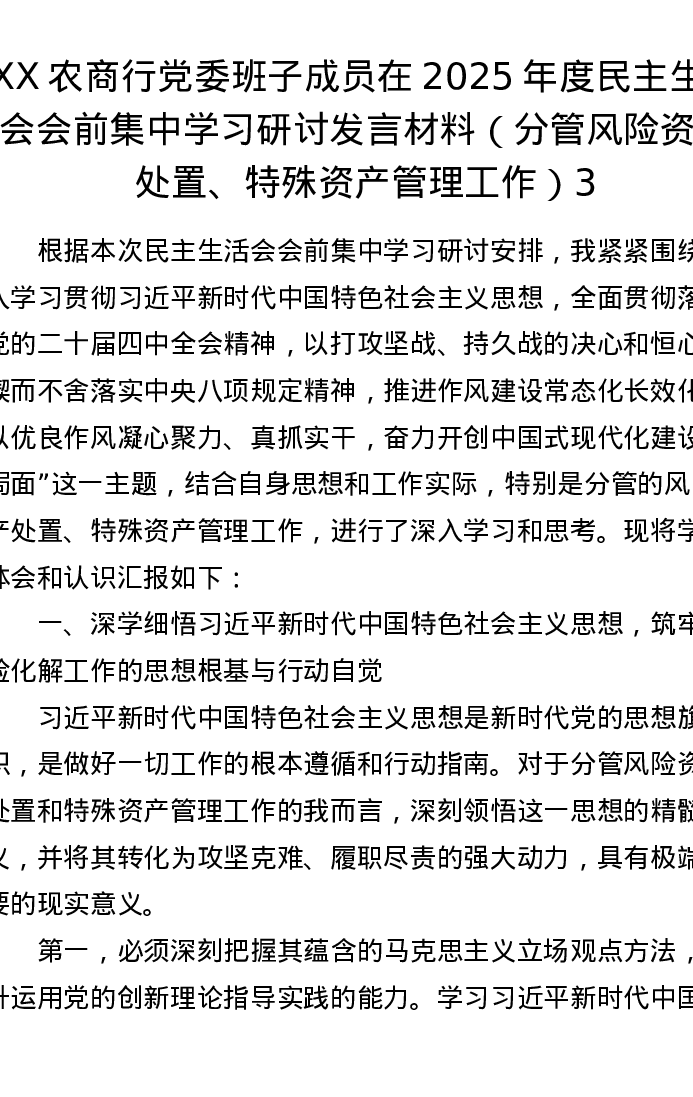 XX农商行党委班子成员在2025年度xxxxx会前集中学习研讨发言材料(分管风险资产处置、特殊资产管理工作)3