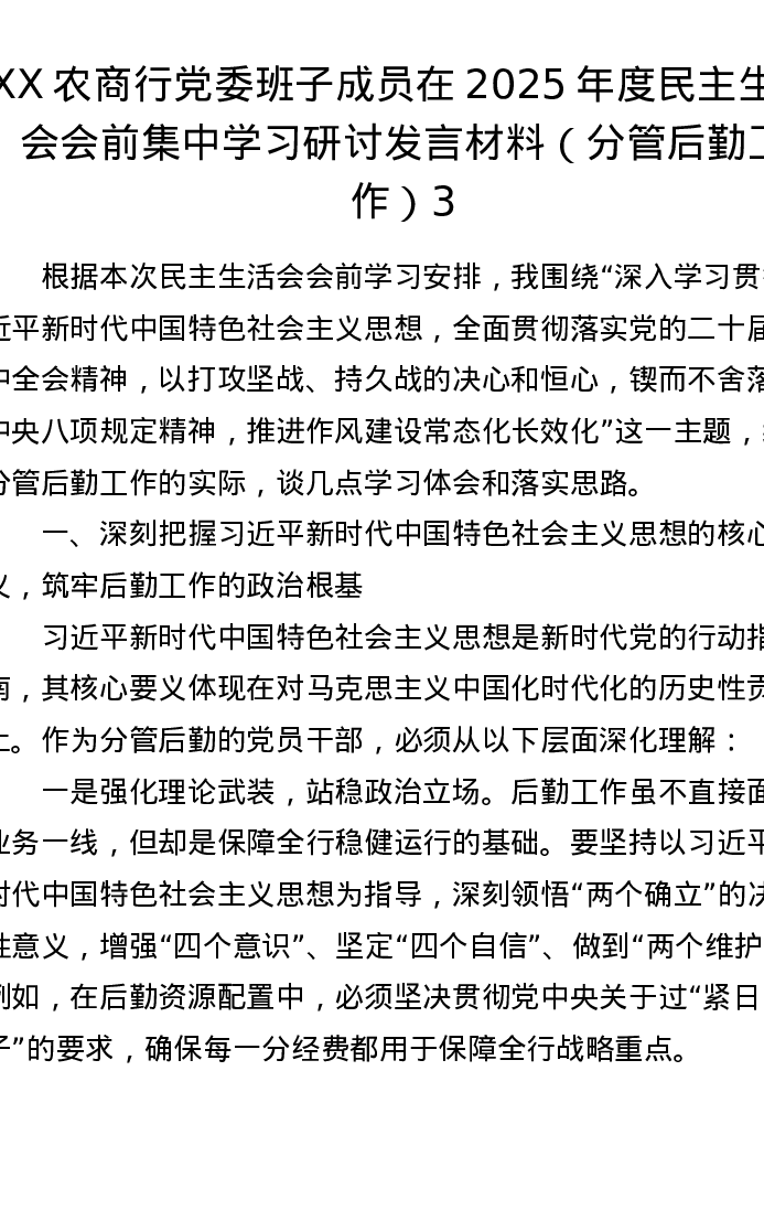 XX农商行党委班子成员在2025年度xxxxx会前集中学习研讨发言材料(分管后勤工作)3