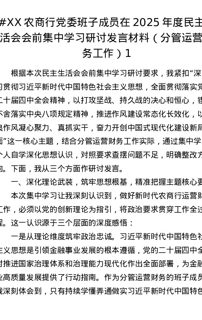 XX农商行党委班子成员在2025年度xxxxx会前集中学习研讨发言材料(分管运营财务工作)1