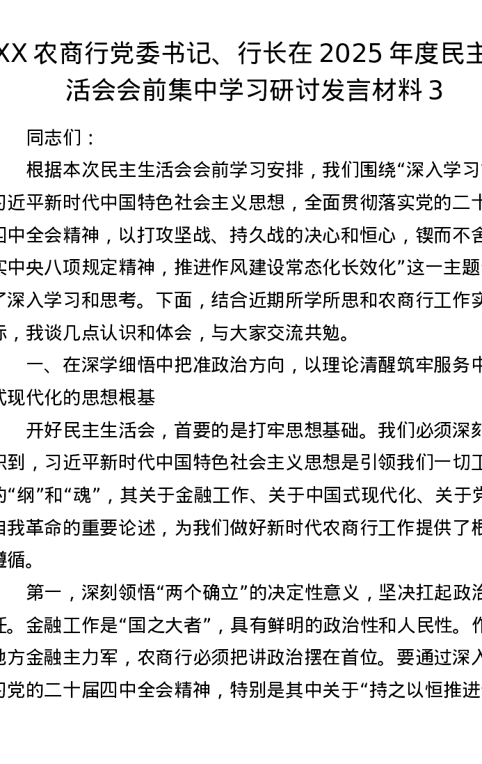 XX农商行党委书记、行长在2025年度xxxxx会前集中学习研讨发言材料3